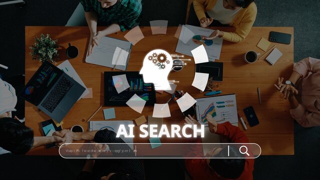 A diverse team collaborates around a wooden table, analyzing data and discussing innovative AI search solutions using technology tools and visual aids. Raster