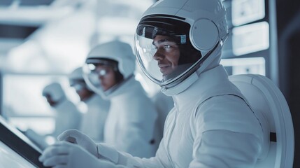 Diverse team of astronauts and engineers working onboard a futuristic spacecraft, utilizing advanced computer systems to monitor and control the mission in space exploration