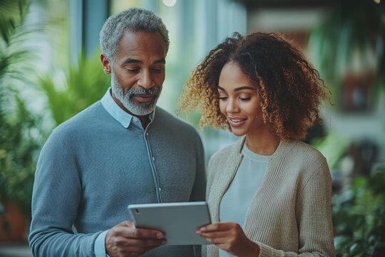 Happy diverse professionals discussing financial market data using tablet in modern corporate office