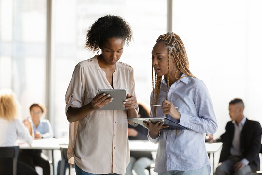 Focused young african american female employees discussing online project results using digital computer tablet applications, consulting about decision, analyzing sales statistics data together.