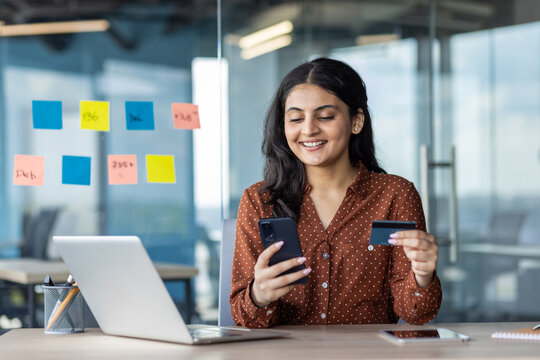 Young hispanic business woman using smartphone and credit card at office desk, analyzing business data on laptop. Concept of multitasking, financial management, technology in modern workspace.