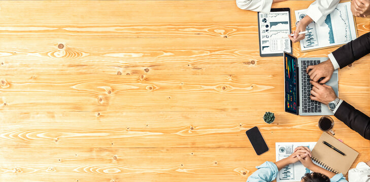 Panorama top view diverse group of business analyst team analyzing financial data report paper on meeting table. Chart and graph dashboard by business intelligence analysis. Meticulous