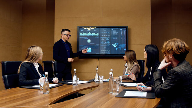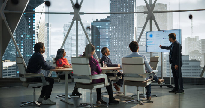 In the Corporate Meeting Room: Creative Director Uses Digital Interactive Whiteboard for Presentation to a Board of Executives, Lawyers, Investors. Screen Shows Company Growth Data with Digital Graph