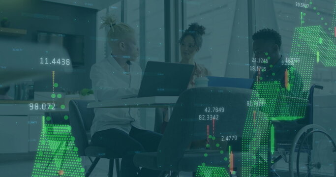 Image of charts processing data over diverse female and male colleague talking at casual office