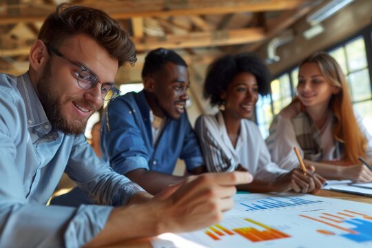 Diverse team collaborating, smiling around a table. Modern office vibe. Ideal for illustrating teamwork, meetings, and successful cooperation.