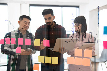 Skilled project manager pointing at glass wall while coworker thinking about plan. Diverse business team working together, brainstorming marketing idea or business plan. Creative start up. Tracery.