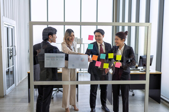 Employee meeting at office and use post it notes to share idea brainstorming stick on glass wall