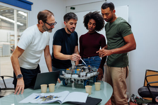 Group of professionals in a meeting, discussing work. Diverse team collaborating, using laptops and tablets. Business attire, teamwork, office setting. Business corporate group teamwork.