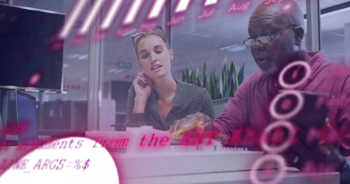 Image of financial data processing over diverse colleagues having meeting in office