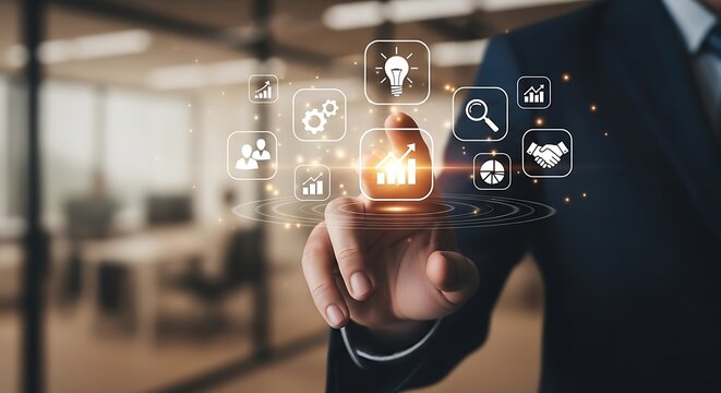 A man in a suit touching a digital interface with various business related icons floating around his finger