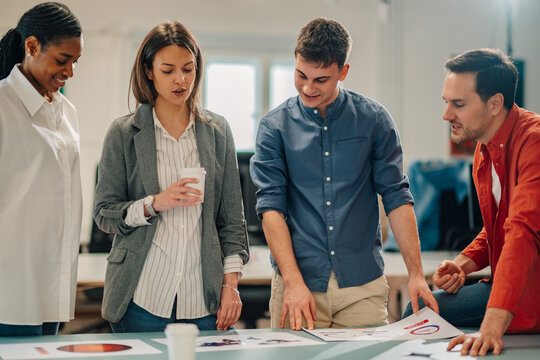 Young and diverse group of people having coffee and relaxing after work in the marketing company office