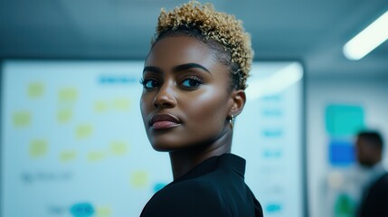 Inspiring Diverse Team Collaboration: Employee Pointing at Digital Tablet in Modern Office Setting