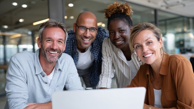 A diverse group of young professionals cheer and celebrate after achieving a milestone while gathered around a laptop in a contemporary office setting.