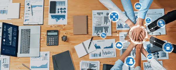 A high-angle view of a teamwork session with diverse hands joining in, surrounded by data analysis reports, digital icons, and tools representing business efficiency and strategy. Amity