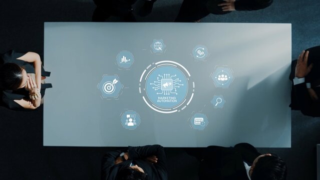 A diverse business team collaborates on a marketing automation strategy, analyzing digital data displayed on a sleek meeting table, fostering innovation and planning. Raster