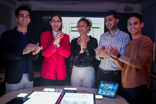 Professional software development team applauding for project success. Happy diverse group clapping hands to celebrate mobile app launch in high-tech startup office.