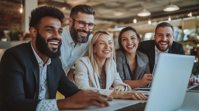 Team of diverse professionals collaborating and smiling around a laptop in a modern office setting during a brainstorming session