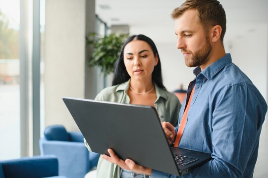 Diverse Team Collaborating Over Laptop In Modern Office Images