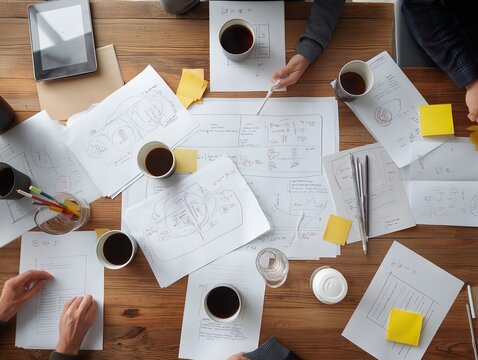 Team collaboration over coffee and brainstorming session with papers and sticky notes