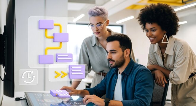 Diverse Business Team Collaborating on Innovative Digital Workflow Using Interactive Display in Modern Office