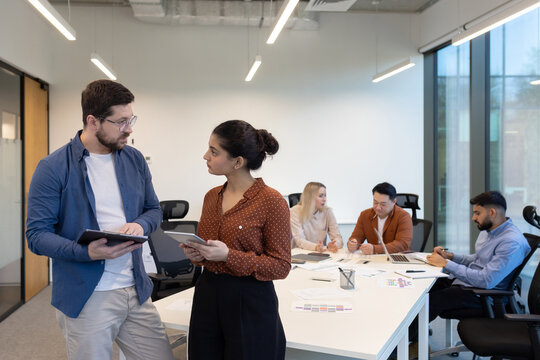 Multiethnic group of young adults collaborating on project, discussing digital interface designs at table with documents and tablet, creative workspace with brainstorming session