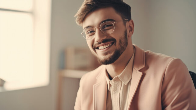 A European businessman in a wheelchair smiles with office colleagues. Generative AI