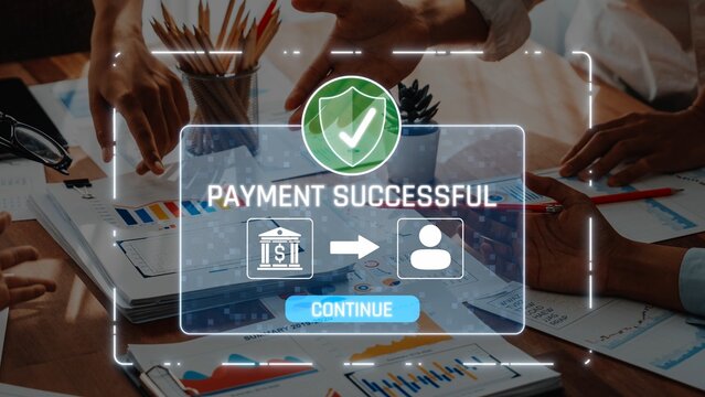 Diverse professionals collaborate on financial documents while confirming a successful payment transaction, highlighting teamwork and digital finance solutions in action. Raster
