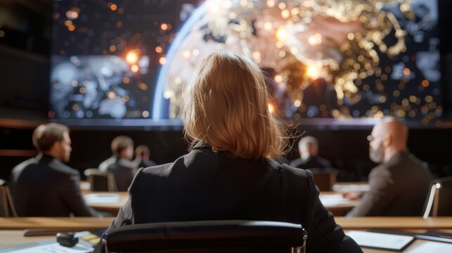 Diverse Professionals Engaged in Strategic Discussion with High-Tech Global Visualization in Background