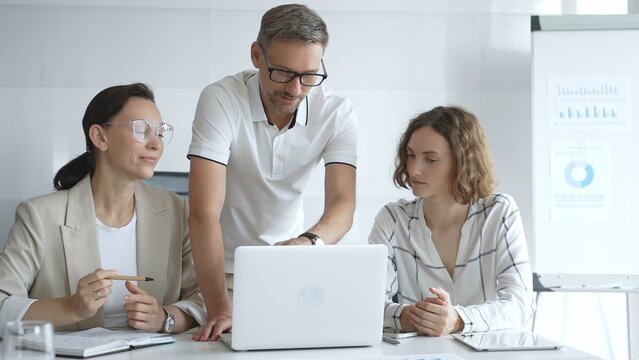 Diverse business people collaborate around laptop in modern office. Smiling colleagues, man and woman, discuss project, share ideas, plan strategy. Teamwork, planning, meeting, corporate life.