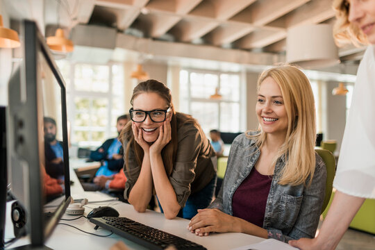 Young and diverse group of female colleagues using the computer together in a marketing company office
