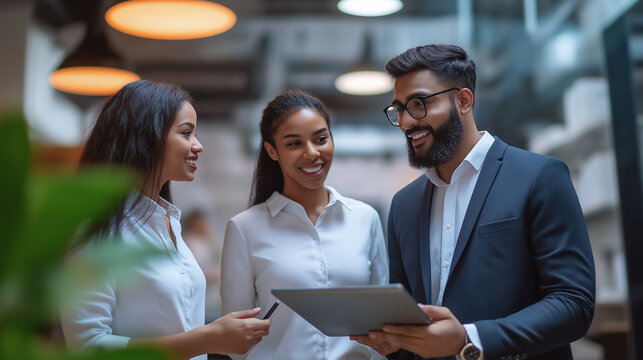 Diverse team collaborates with technology at office