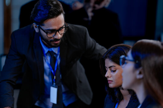 Future AI control center. Diverse oversight team monitors autonomous system performance. Analyzing real time execution logs and data streams displayed on advanced computer screens late night.