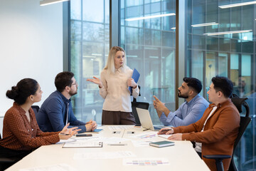 Collaboration in a modern office setting with a diverse business team sharing ideas