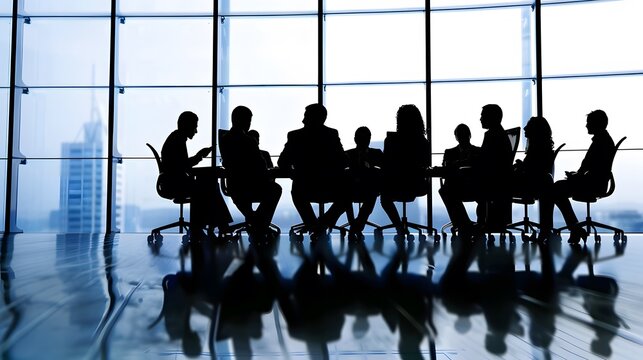 Silhouettes of a diverse board of directors in a corporate meeting room, discussing company strategy and future plans.