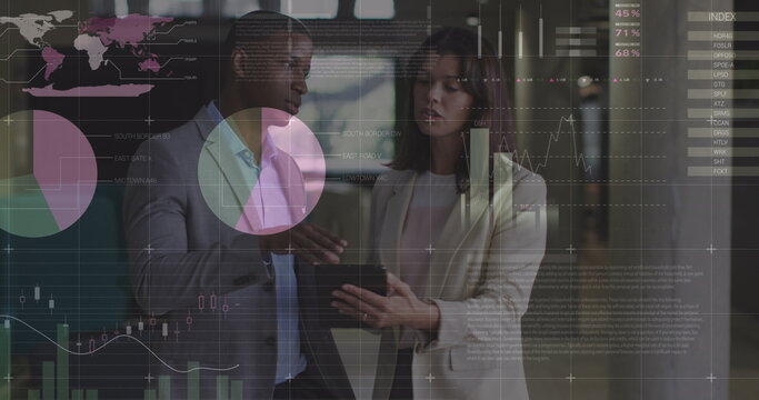 Image of statistical, stock market data processing on diverse man and woman discussing at office