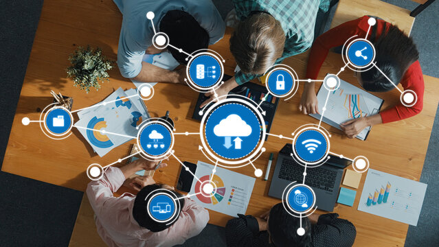 Top view of manager working on laptop and sending data analysis to business people by using VR glass headset while diverse team moving gesture while working together to planning idea. Directorate.