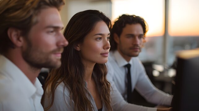 A diverse team of professionals engaged in a collaborative business meeting focused on computer screens during a warm golden hour