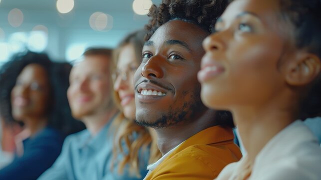 Collaborative brainstorming session with cheerful professionals in an office, focusing on strategy and planning. Diverse team engaged in a seminar led by a corporate leader