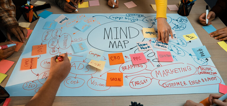 A vibrant scene of a collaborative mind mapping session showcasing diverse hands engaged in brainstorming marketing strategies using colorful notes and diagrams. SACTR