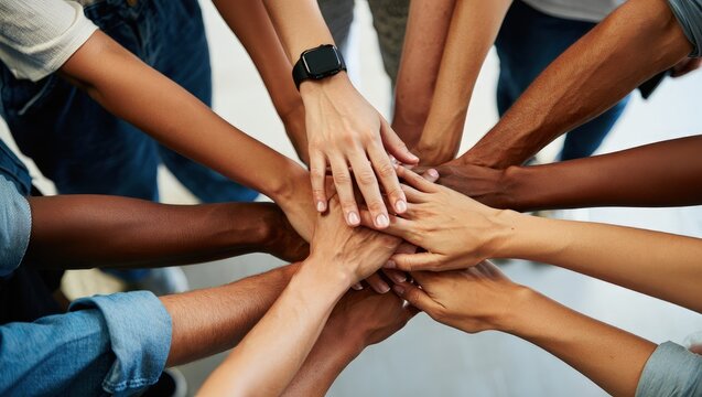 Teamwork concept with diverse hands joining together, symbolizing unity, cooperation, and collaboration