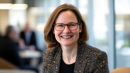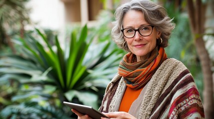 A professional class model businesswoman in a modern office setting, confidently presenting a digital tablet to a diverse group of colleagues, with a clean and minimalist background