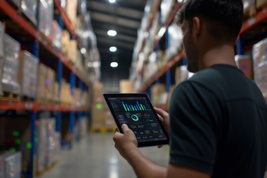 A warehouse worker uses a digital tablet to analyze inventory and operational data while standing in a modern storage facility, with shelves stocked with various goods