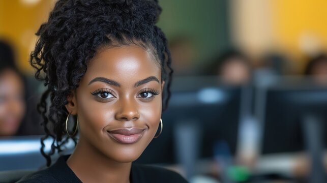 A young woman with intricate braids smiles while working on a desktop in a computer lab, surrounded by focused individuals, highlighting a diverse, tech-driven learning environment. Tech diversity