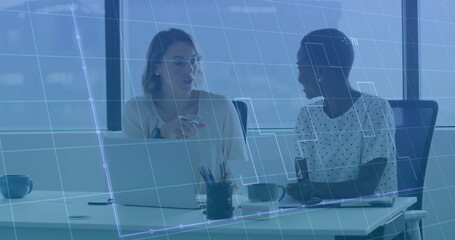 Discussing women collaborating around laptop in open-plan office, with coffee and digital overlay