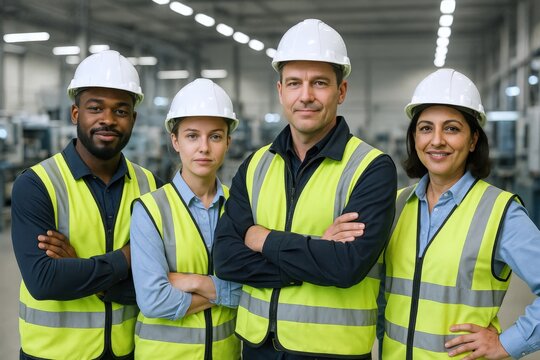 Team of diverse workers in safety gear representing the modern workforce in an industrial setting