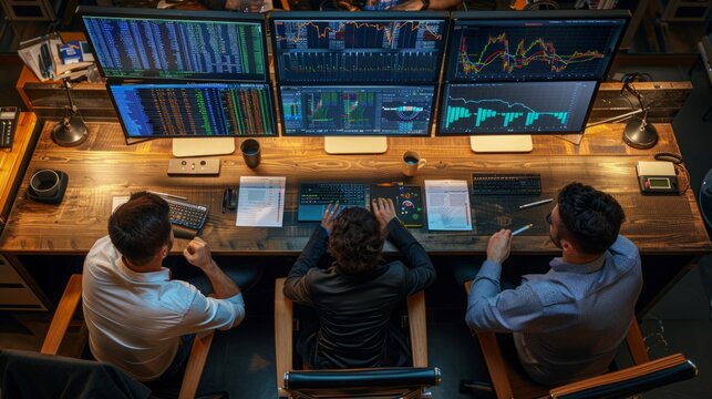 Three individuals are seated at a desk with several computer screens displaying various information. They appear focused and engaged in their work.