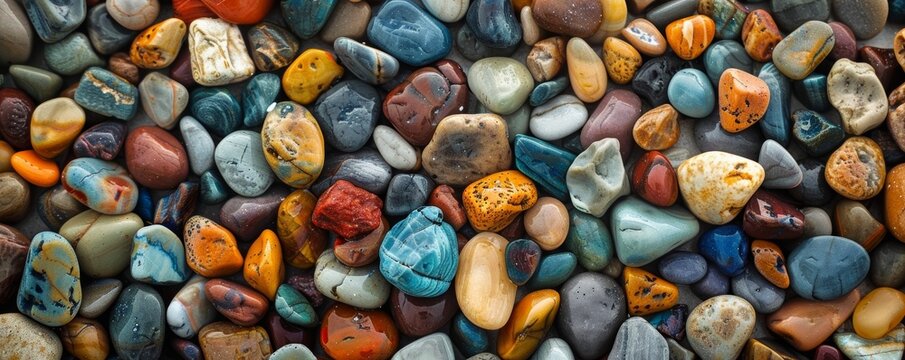 abstract Smooth, multi-colored stones gravel closely packed together showing natural diversity and textures.