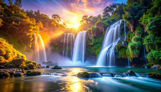 Magical waterfalls cascading in different directions, each glowing with unique tones to represent diversity in flowing design