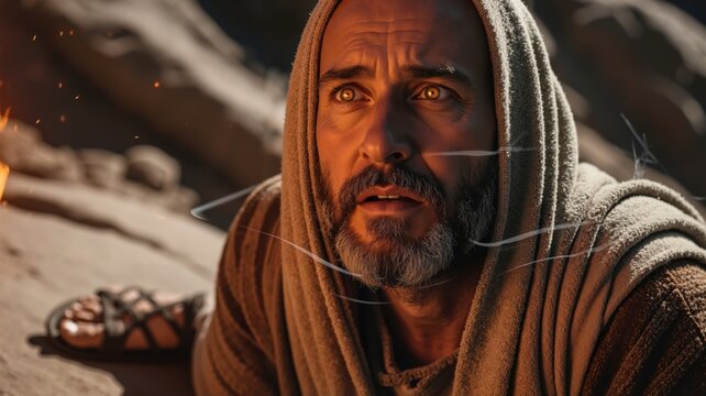 Cinematic close-up of the biblical prophet Moses listening in reverence. His eyes reflect firelight during a divine encounter in the desert. A depiction of faith and a holy calling from the Old Testam