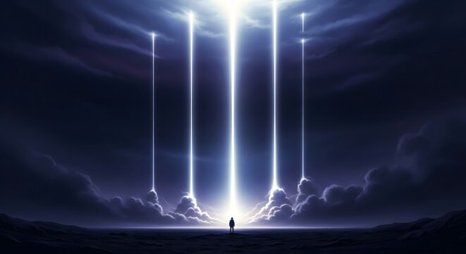 Ethereal Encounter - Silhouettes in the Mist Before a Divine Pillar of Light.